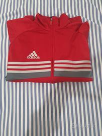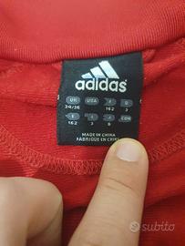 Giacca da training Adidas originale, modello classico track jacket in colore rosso vivo con inserti grigi sulle spalle e sui fianchi. Il design è iconico, con le tre strisce bianche sul petto che scendono lungo le maniche, logo Adidas ricamato in bianco sulla parte alta del petto e un piccolo logo tono su tono sul colletto posteriore. La giacca è a chiusura completa con zip centrale e presenta due tasche laterali. La taglia è S, come confermato dall’etichetta interna nera, perfettamente integra e leggibile, che riporta anche la dicitura “Made in China” e le equivalenze internazionali (UK 34/36, EU 162). Il capo è stato indossato pochissime volte, sempre lavato con cura e si presenta in condizioni quasi nuove: nessun segno di usura, sbiancamento o difetti visibili, tessuto morbido e ben tenuto, zip funzionante e cuciture intatte.