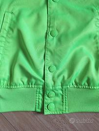 Giacca da college Adidas verde brillante, con strisce bianche lungo le maniche e logo arcobaleno sul petto.