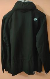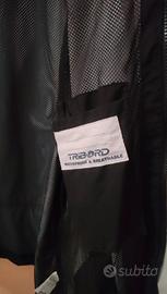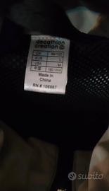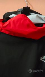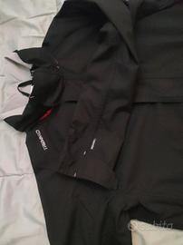 Giacca antivento-pioggia traspirante (impermeabile), nuova mai usata, Decathlon création, taglia L. Con cappuccio colore rosso ripiegato all' interno del colletto (vedi foto), chiusura con velcro sulle maniche per stringerle, Novadry. Dimensioni in cm: da spalla a spalla cm 50, da ascella ad ascella cm 65, giro petto cm 130, lunghezza cm 75