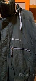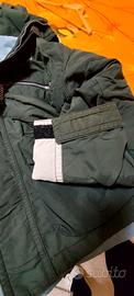 Giàcca antivento uomo, leggermente imbottita, verde scuro con particolari panna, cappuccio che si può togliere e polsi regolabili,TG L, spalle cm 58, circonferenza petto cm 136, lunghezza cm 79
