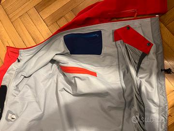 Giacca sabre da uomo, guscio freeride con protezione GORE-TEX e anti-tempesta. Taglia S. Interno spazzolato con ghetta anti- neve, tasce sul braccio per lo sky pass e due tasche interne. Colore rosso.