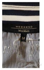 Max Mara linea Weekend, giacca stile Marina , modello corto , fantasia a righe bianche e blu , collo a rever, chiusura monopetto con bottoni, taschino sul petto impreziosito da paillettes, più due tasche con pattina, spacchetto basso sul dietro. TG M . Misure: Spalle 40 cm , Torace 44 cm, Girovita 76 cm , Lunghezza maniche 60 cm , Lunghezza totale 57 cm