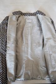 Giacca corta Armani Collezioni in lino e seta. Linea avvitata con spalline sottili e motivi geometrici bianchi e neri. Fodera interna in seta color argento. Scollo alla coreana. Chiusura frontale monopetto con cinque bottoni di colore beige. Made in Italy.