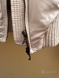 Giacca corta da donna firmata Armani Jeans, colore beige chiaro. Modello imbottito con design moderno e dettagli ricercati, come le cuciture curve sul davanti e sulle maniche. Chiusura con zip frontale, colletto alto e polsini/lavorazione a coste su vita e maniche per una vestibilità aderente e confortevole. Interno foderato con elegante stampa floreale.