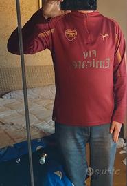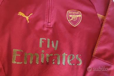 Giacca sportiva Arsenal Puma 2017/18 Ultima stagione Puma. Training top ufficiale dell'Arsenal risalente alla stagione 2017/2018, l'ultima prodotta da Puma prima del passaggio ad adidas. Modello 1/4 zip con dettagli oro e sponsor Fly Emirates. Capo originaleormai difficile da trovare, ideale per collezionisti e appassionati dei Gunners. La giacca e in buone condizioni ha il logo frontale un po' sgranato per via dei lavaggi e anche una piccola parte del logo di dietro come potete vedere in foto. Tg L regolare. Regolatevi in base alle misure che sto per darvi. Misura spalle 45, lunghezza giacca 70, misura ascelle 50, lunghezza maniche 55.