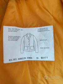 Giacca monopetto con revers classici di Alberto Aspesi da donna colore giallo zafferano modello PN51 Bambolina Summer. Giacca realizzata in materiale definito taffettà tecnico 40 denari do nylon leggero come indicato nell'etichetta dentro la giacca. La giacca è un modello che ha una vestibilità leggera e versatile e si presta a indossare anche sotto un capo spalla vista la sua leggerezza. È più leggera di altre giacche di Aspesi in quanto meno imbottita. Misure: spalle cm 43, lunghezza cm 56, da ascella ad ascella cm 49, lunghezza maniche cm 64. La giacca è dritta non sfiancata. Taglia indicata XL e secondo me veste meno perché io la indosso e porto una 44 e una terza di seno e mi sta stretta sul seno. Le taglie di Aspesi sono un po' particolari.