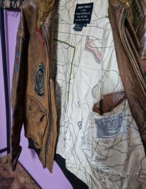 autentica giacca da volo Avirex G-1 in pelle, modello classico ispirato all'aviazione militare americana. La giacca invecchiata presenta numerose toppe che indicano la sua associazione con specifiche unità navali e operazioni.
