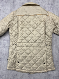 Giacca Barbour originale, modello Sporting Quilt JKT, colore beige, trapuntatura a rombi, tasche con zip e bottoni, interno in classico tartan Barbour. Stile british heritage, perfetta per la mezza stagione. La giacca è in ottime condizioni generali, con una piccola macchia rosa all’interno del colletto, probabilmente da rossetto. Ho provato a lavarla con detersivo delicato, ma non è andata via del tutto. Essendo interna e non visibile quando indossata, non compromette l’estetica né l’uso. Volendo, si può portare in lavanderia per una pulizia più mirata.