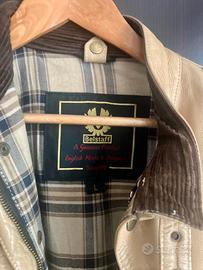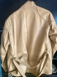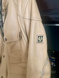 Iconica giacca Belstaff in pelle color beige, perfetta per un look casual o da motociclista. - Materiale: Pelle - Colore: Beige - Dettagli: Fodera a quadri, colletto in velluto a coste