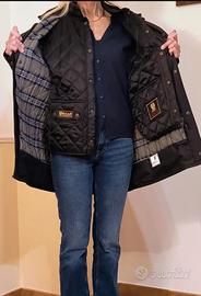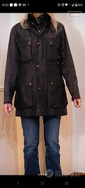 Giacca Belstaff Trialmaster In cotone cerato 170gr, idrorepellente e antivento. Classica fodera in twill di cotone a quadri. La giacca è completa del gilet Icon nero, imbottito con trapuntatura a rombi utile ad aggiungere un caldo strato intermedio, dotato di regolatori con bottone automatico sul girovita e due ampie tasche inferiori con bottoni a pressione. Taglia 44 Usata molto poco. Sul sito della Belstaff si può verificare il prezzo pari a €550,00 per la giacca e €250,00 per il gilet.