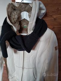 Giacca Benetton da donna, taglia S, in cotone color panna ed ecopelliccia all'interno. Validissima opzione per le mezze stagioni quando la giacca invernale è troppo pesante e una felpa è troppo leggera! Cappuccio, due tasche e chiusura con cerniera perfettamente funzionante. Vendo per cambio taglia. Possibile la spedizione.