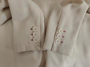 Giacca blazer marca Bershka, tg. L, tessuto crêpe, colore panna rosato, chiusura a 1 bottone, con spalline, asole bottoni maniche in colore rosa, tasche ancora sigillate. Come nuovo, usato 2 volte e lavato in tintoria (etichetta verde). Come da foto.