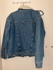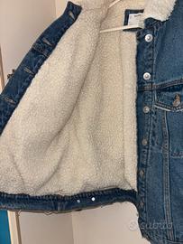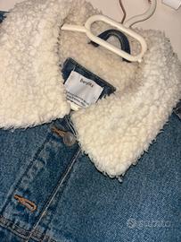 giacca trucker in denim con colletto sherpa (o fodera in agnellato sintetico) * Materiale Esterno: Realizzata in denim di cotone robusto, con un lavaggio blu medio ("medium wash") che presenta leggere scoloriture sulle cuciture e sulle tasche per un effetto vissuto. * Colletto e Fodera: Il pezzo forte è il colletto a contrasto in borg (lana sintetica o sherpa) di colore bianco crema. All'interno, la giacca è solitamente foderata in pile o agnellato per offrire calore extra. * Chiusura: Bottoni metallici a pressione sul davanti e sui polsini. * Vestibilità: Taglio "Regular" o leggermente "Boxy" (quadrato), tipico dei modelli vintage anni '90.