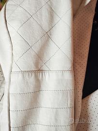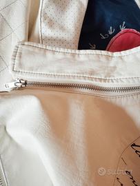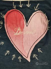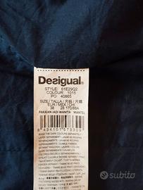Giacca donna in finta pelle Desigual con chiusura a cerniera asimmetrica, motivo a micropunti e cuciture trapuntate sulle braccia. Pannello frontale sinistro decorato con scritte in stile calligrafico e ricami circolari. Interno in fodera blu con grande cuore rosa applicato.