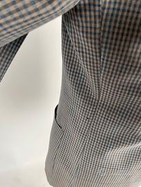 Elegante tessuto microcheck beige e blu con riga azzurra, tipico stile britannico classico.