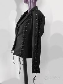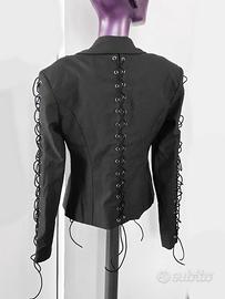 blazer nero con lacci dietro e su maniche. blazer nero strutturato con spalline, chiusura con gancetto, blazer sciancrato. mai usato. veste taglia S, misure nelle foto. blazer strutturato, con maniche lunghe e gancetto come chiusura. Blazer stile vintage con spalline rigide. blazer sciancrato donna con lacci, giacca primaverile nera, o giubbotto con lacci, blazer aderente in vita, modello affusolato, ideale per università, lavoro o casual