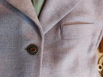 Bellissima giacca tipo blazer di ottima qualità e fattura, in lana pettinata, foderata, con bottoni molto carini, bel punto di lilla, leggermente più lunga di una giacca normale. Indossata in poche occasioni, è in perfetto stato. Taglia 44.