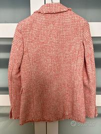 Vendo bellissima giacca blazer firmata Mango, caratterizzata da una raffinata lavorazione in tweed nei toni dell'arancio e bianco. Un capo elegante ma versatile, perfetto sia per l'ufficio che per un look casual-chic con i jeans.