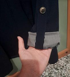 Giacca blu con particolare risvolto maniche a righe e bottone. Indossata solo una volta. Tessuto particolare, non liscio