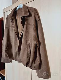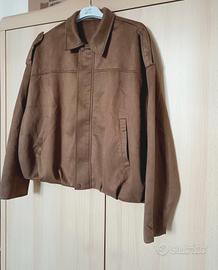 Giacca modello bomber di camoscio, taglia L, con due tasche frontali e fodera all'interno. Colore marrone/beige. Nuovo