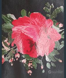 Dettagli Frontali: Elegante stampa floreale (rosa rossa) sul petto e tasche rifinite con micro-borchie argentate applicate verticalmente.