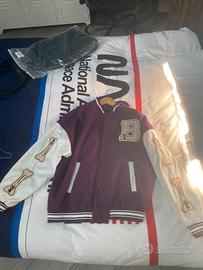 giacca bomber/varsity (stile college) caratterizzata da toppe a forma di ossa/scheletro sulle maniche e un logo con la lettera "B" sul petto.