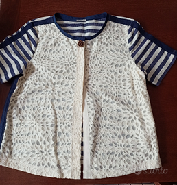 Giacchina molto particolare in cotone e pizzo tg M con apertura nascosta da 3 bottoncini e uno splendido bottone gioiello sul davanti. Rifiniture in grogret di cotone blu. Indossata una sola volta.