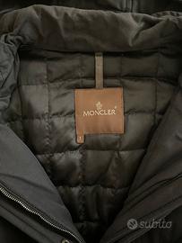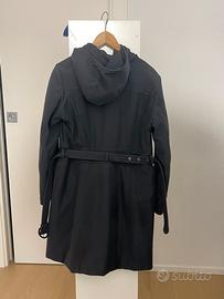 Giacca cappotto media lunghezza, con cappuccio e cintura, marca Moncler.