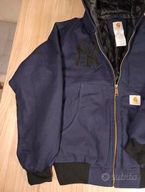 Giacca originale Carhartt, colore blu navy, con logo New York Yankees ricamato sul petto. Modello unisex, mai utilizzata, nuova, in condizioni perfette. Dotata di cappuccio, chiusura con zip frontale, tasche laterali e polsini elasticizzati. Interno caldo e resistente, ideale per l'inverno e le mezze stagioni più fredde. Stile streetwear / workwear / casual, capo iconico e versatile, perfetto sia per uomo che per donna. Presente patch Carhartt originale cucita.