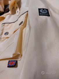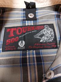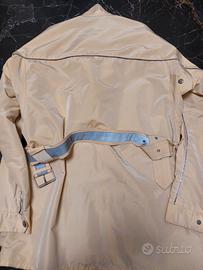 Giacca cerata Belstaff modello Tourmaster 500, color crema con dettagli grigi a contrasto e fodera interna fantasia tartan, senza imbottitura.