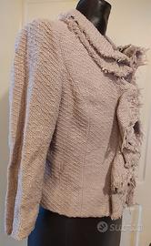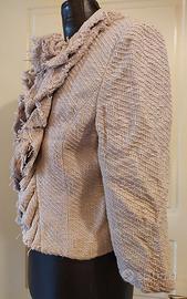 La giacca chic da donna in cotone tricot color cipria la chiusura a laccetto con una rosa in tessuto riportata sul revers il modello elegante di tendenza taglia 46 ed altre. Nuova originale ed autentica Biancoghiaccio - Made in Italy