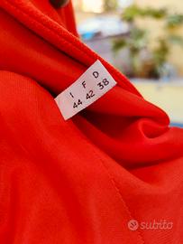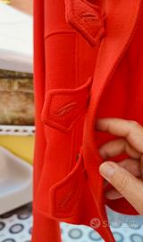 Capo di alta moda sartoriale color arancio sangue brillante dal taglio strutturato che si delinea svasando davanti e sui fianchi.