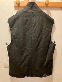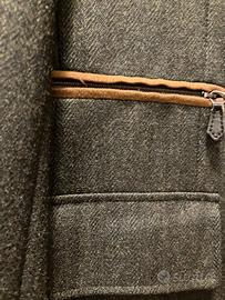 Bellissima giacca di sartoria, completa di gilet abbinato. Il gilet si può attaccare o staccare con dei bottoncini alla giacca o indossare anche staccato. Dettagli delle tasche della giacca e colletto interno del gilet in scamosciato.