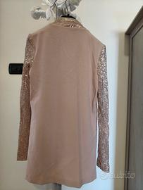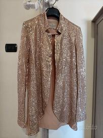 Vendo giacca colore cipria e paillettes colore oro rimane aperta senza bottoni molto elegante multiuso.Materiale poliestere.In ottimo stato. Marca Rinascimento.