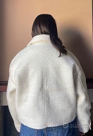 Giacca in bouclé in tinta unita con collo polo e tasconi frontali con patta, chiusura frontale tramite zip. Vestibilità: crop fit.