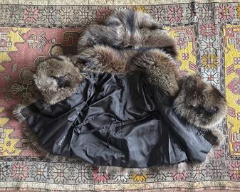 Perfetto giacchino corto con cappuccio il pelliccia di procione o marmotta canadese. Il cappuccio è fissato con tre clips ed è completamente staccabile.