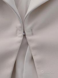 Giacca di colore bianco panna foderata e seminuova. Il capo si allaccia con un solo gancio e bottoni con logo alle maniche. Per mancanza di spazio non ho potuto mettere le foto con misure. La taglia è una 46 ma veste meno.