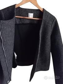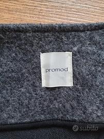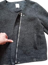 Giacca corta da donna, di colore grigio scuro. Marca Promod. Modello asimmetrico , in cotone, elastina e poliestere. Taglia S, taglia italiana 40. In ottime condizioni. Misure: Lunghezza totale: 51 cm Misura da ascella ad ascella: 47 cm Lunghezze delle maniche: 60 cm Spalle: 39 cm