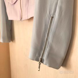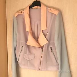 Giacca corta dai colori pastello (pesca, azzurro, lilla), chiusura con cerniera, due micro tasche con cerniera e una finta tasca davanti, zip sul fondo delle maniche.