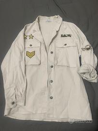 Giacca cotone jeans donna modello Oversize , con tasche e decorazioni militari, taglia unica . Larghezza 56 cm