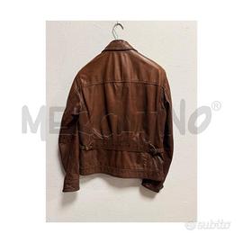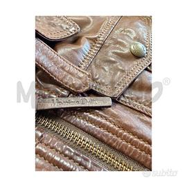GIACCA MASSIMO DUTTI TAGLIA M IN PELLE MARRONE COGNAC. STILE AVIATORE CON COLLETTO CLASSICO ZIP FRONTALE SEI TASCHE CON BOTTONI AUTOMATICI E CINTURA REGOLABILE POSTERIORE. DESIGN VINTAGE RAFFINATO PERFETTA PER LOOK CASUAL CHIC.