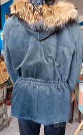 Giacca da donna in camoscio blu con bordi in pelo. Giacca di sartoria.