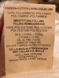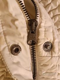 Giacca da donna in tessuto trapuntato di poliestere colore bianco/panna il modello glamour di tendenza con il collo in tessuto di lana ed alcuni elementi sulla vita i polsini e la spalla in tessuto color rosso a doppia chiusura con zip e bottoncini in metallo a pressione anche sui polsi internamente foderato in poliammide con imbottitura in lycra ed altre fibre taglia 44 (N.B. L'etichetta è mancante consultare le misure riportate precise al cm.) giud010. Lunghezza 56 cm. lunghezza dal collo alla vita 68 cm. larghezza della spalla 42 cm. larghezza del torace da ascella ad ascella 51 cm. lunghezza delle maniche 65 cm. In eccellenti condizioni è mancante l'etichetta della taglia. Made in Italy - Fay N.B. E' in vendita solo su TuttoSubito con i sistemi di pagamento e di spedizione in esso contenuti.
