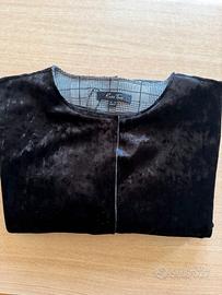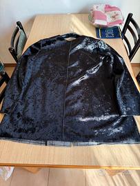 Vendo giacca in velluto nero con caratteristico effetto stropicciato o sfumato, simili a modelli come abito in velluto grigio di Forte-Forte, chiusura con bottoni a clip, color nero lucido. Taglia: M;