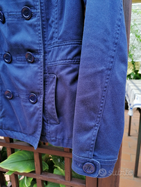Giacca in stoffa mezza stagione, chiusura con bottoni, stile doppio petto, colore blu, dettagli sulla spalla, tasche laterali. Indossato poche volte, taglia 36.