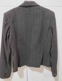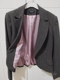 Elegante giacca da donna, tessuto a spina marrone e grigio con righe verticali rosa .Fodera interna in acetato rosa.Chiusura con 1 bottone,tasche frontali con patta.