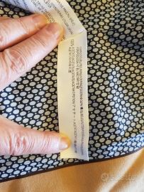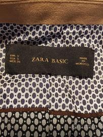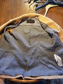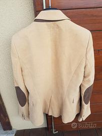 Pratica giacca in cotone pesante, taglia S, color nocciola con toppe sui gomiti e sotto colletto a contrasto in color testa di moro. Internamente rifinita con fodera a piccoli motivi geometrici, ideale per la mezza stagione. Usata ma in perfette condizioni