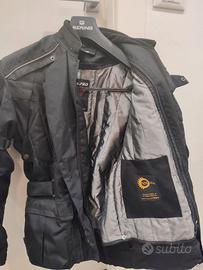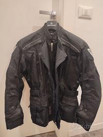 Giacca da moto American PRO in tessuto con doppia zip di chiusura e tre strati. Membrana interna impermeabile rimovibile (AcquaKill) e strato interno termico rimovibile. Tasche per inserimento protezioni su schiena, spalle e gomiti. Le protezione vecchie sono state rimosse perché usurate. Zip esterna leggermente difettosa.