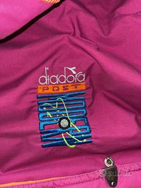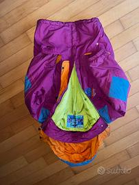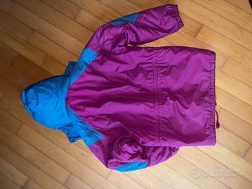 Materiale: esterno 100% nylon impermeabile e antivento (tipico delle giacche tecniche vintage), imbottitura in fibra sintetica (poliestere) calda e leggera, interni con accenti arancione e verde (cappuccio e dettagli) per extra calore e stile pop.