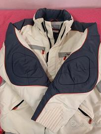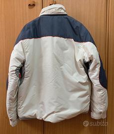 Giacca da sci vintage (anni ‘90) da uomo, taglia 48, marca Brugi. La giacca è bianca con inserti grigi, ha 4 tasche sulla parte davanti, 2 sull’avambraccio e altre 3 interne. Ha una doppia chiusura, con cerniera e a strappo. Regolabile sia in vita sia ai polsi. Rinforzata sui gomiti. Rivestimento interno grigio e morbido pile sul collo. Usata molto poco, unico difetto: manca il cappuccio.